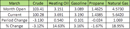 The natural gas storage reports throughout March showed weekly withdrawals less than was estimated. However, inventories continue to be 20% less than the same period last year and 17% less than the 5-year average.